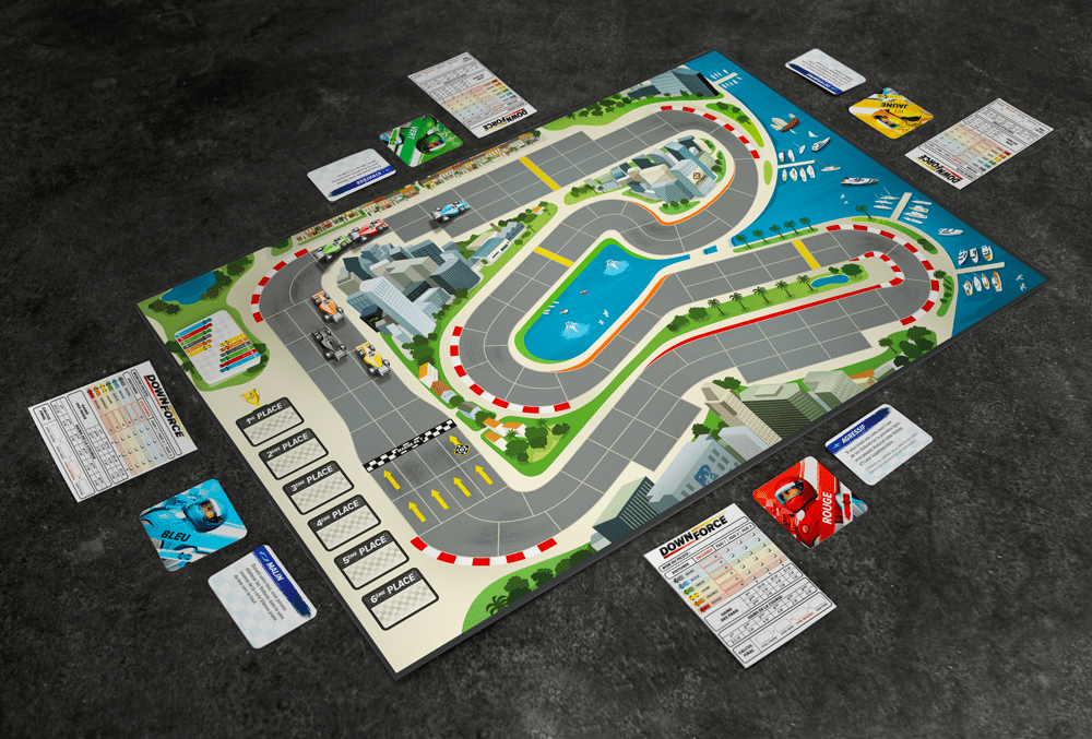 Downforce, Wolfgang Kramer’ın klasik tasarımının Restoration Games tarafından restore edilmiş modern versiyonudur. Kart odaklı bir yapıda oyuncular önce arabalar için açık artırmaya girer; daha sonra ellerindeki hız kartlarını oynayarak araçları pistte hareket ettirir ve yarış sırasında gizli bahislerle ekstra kazanç şansı ararlar.